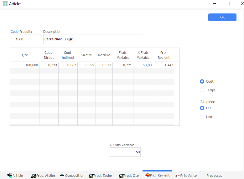 - Calcule le prix de revient basé sur deux variables : la main d'œuvre et le prix d'achat des matières premières que nous appelons 'Frais variables' (ces frais varient d'un produit à l'autre).